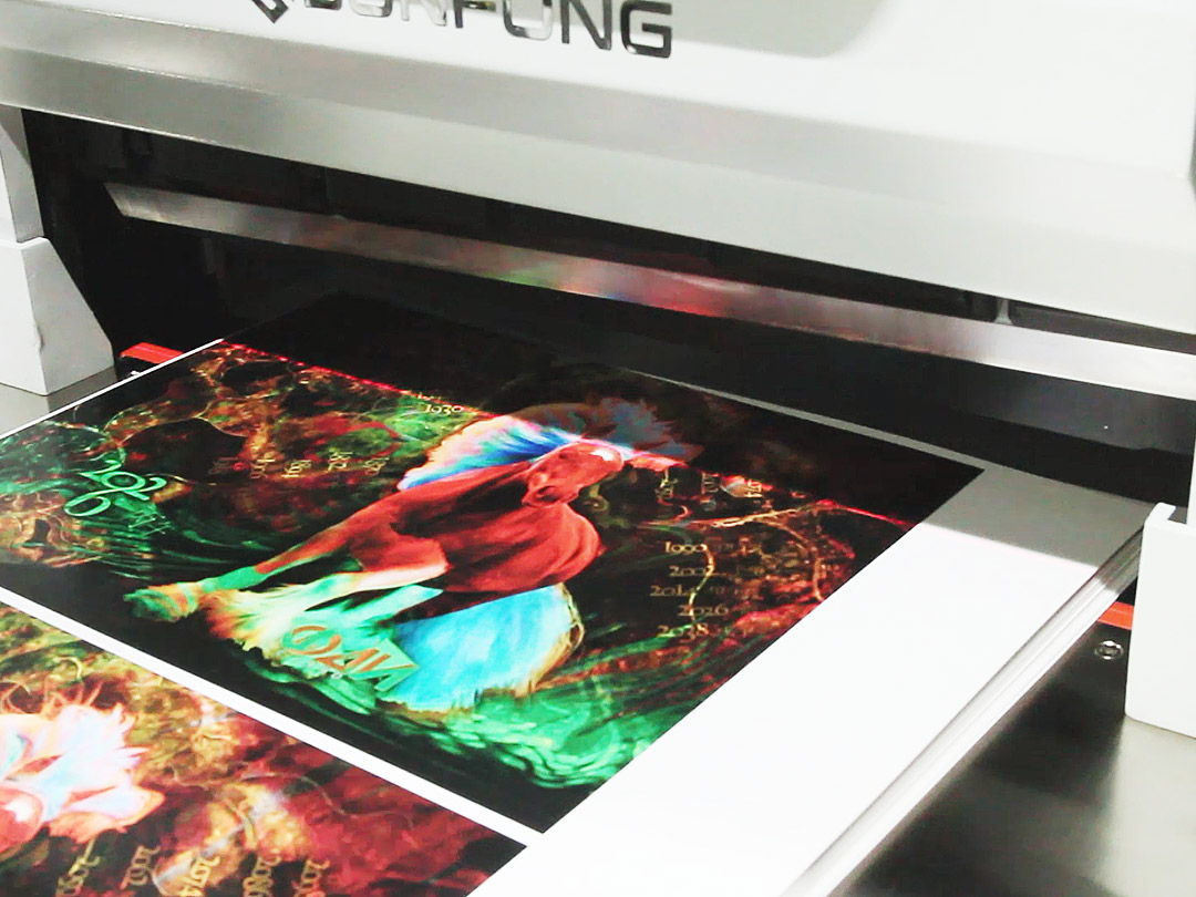 Печать производилась на планшетном УФ плоттере Grando GD-6090UV Pro, с размером рабочего стола 600 х 900 мм и чернильной схемой CMYK + белый + лак. Данный УФ принтер оснащен тремя печатными головами i1600 обеспечивающими высокое качество печати и производительность. По сравнению с младшей моделью Grando GD-6042 скорость увеличилась практически в 4 раза. Один печатный лист 500 х 700 мм, на котором размещалось 4 календарных топа печатался чуть более 5 минут (в печати использовался выборочный лак). В конечном итоге весь тираж, который составил 150 отпечатков (75 листов с двух сторон) был отпечатан за 1,5 рабочих дня. Отпечатанный тираж календарных топов был вырезан в формат на электрическом гильотинном резаке SunFung SF-460E. При резке основная сложность была соблюсти давления прижима достаточное для удержания стопы, скользкой за счет напечатанного лака и с другой стороны, не допустить деформации бумаги, опять же из за напечатанного лака, при чрезмерном прижиме.